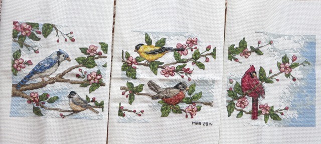 And Monica found time to finish the triptych cross stitch she has been working on for more than a decade. A beautiful trio of birds on a continuous branch in full blossom (maybe cherry). Can’t wait to get this framed and on the wall. Will blog it again, I’m sure.