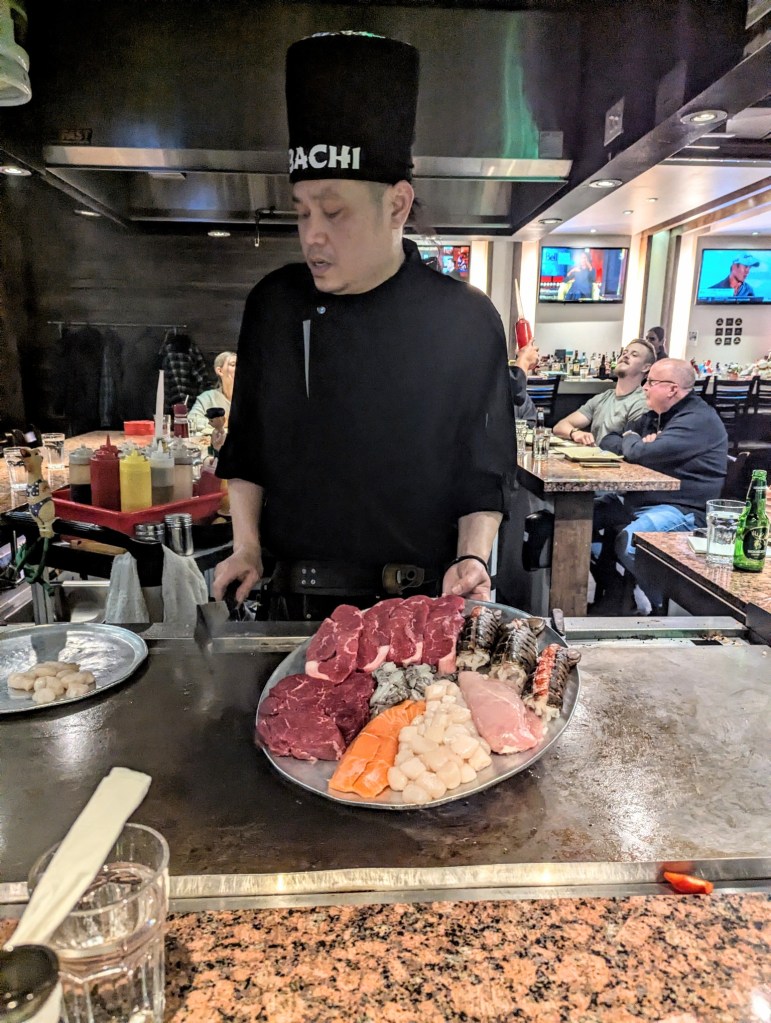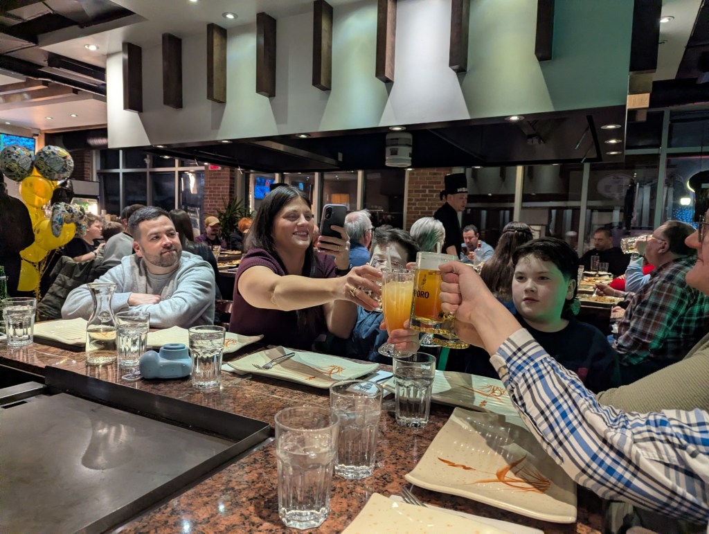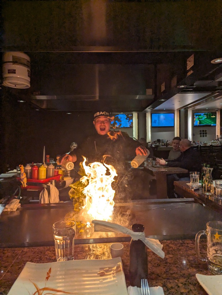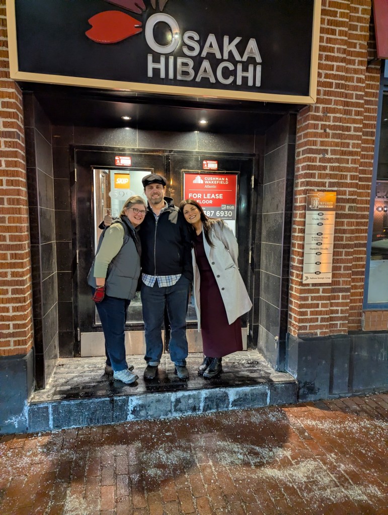 It was a wonderful weekend of family frolic and great food to celebrate Valentine’s Day, Ryan’s 40th birthday and Family Day all at the same time. First up, Ryan, Monica and I enjoyed a delicious ramen meal at Umami Kid restaurant in Saint John. Then we joined with Sarah’s family for a one-night get away to the Delta Beausejour Hotel in Moncton. The heated pool and water slide were so was much fun but the highlight was the dining experience at Osaka Hibachi restaurant (right across the street from the hotel). The chef was brilliantly entertaining and the food amazing.