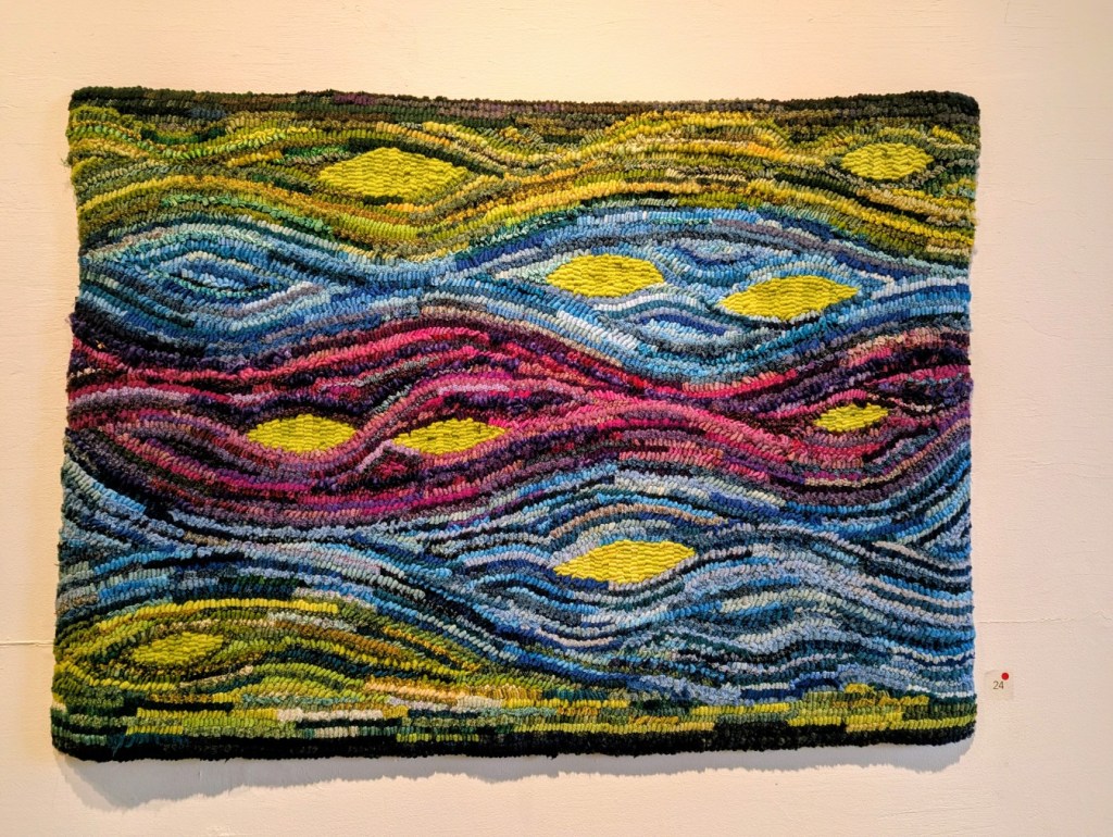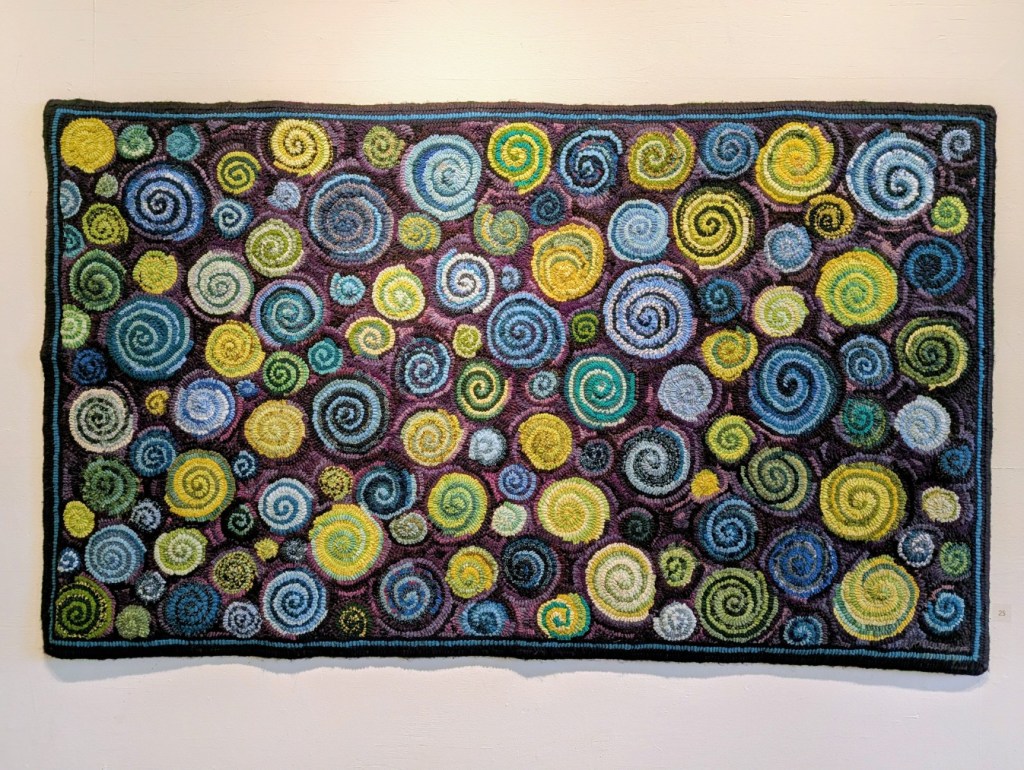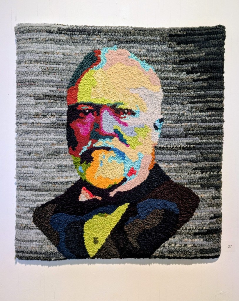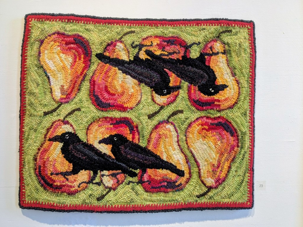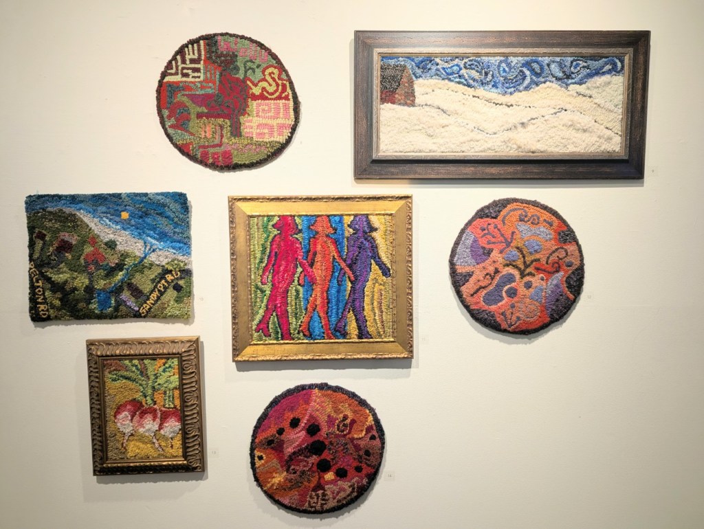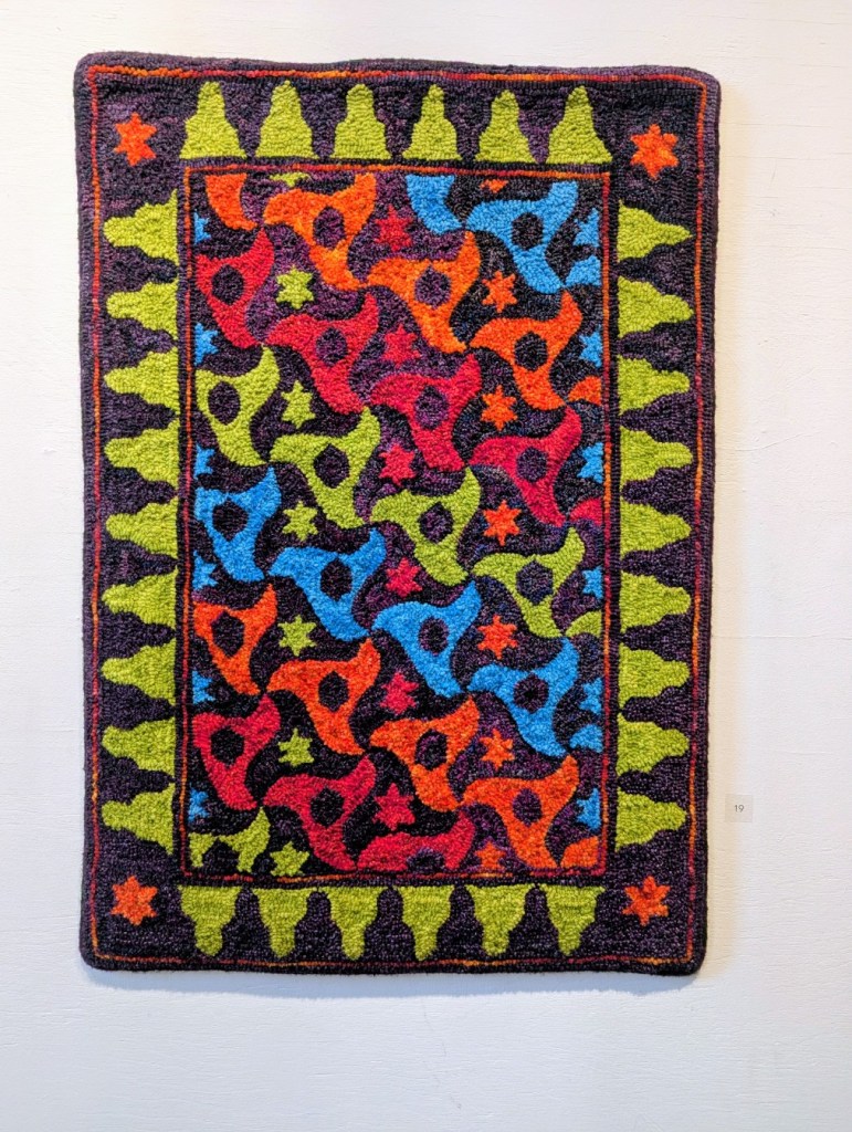 The Saint John Arts Center is the weekly meeting place of the Carnegie Rug Hookers group; a local organization of craftspeople focused primarily on Rug Hooking. Since I have started hooking myself, I am interested in meeting like-minded people. So, today Monica and I visited the Arts Center specifically so I could meet the people and see what they are creating. I was inspired and even picked up a couple of hooking tips during the visit. One of the group members, Tzigane Caddell, actually has an exhibit currently at the center. Wonderful to see that and get even more inspired. Here is some of her work.