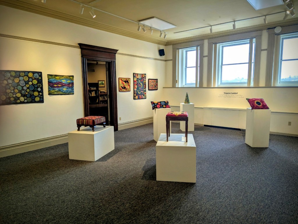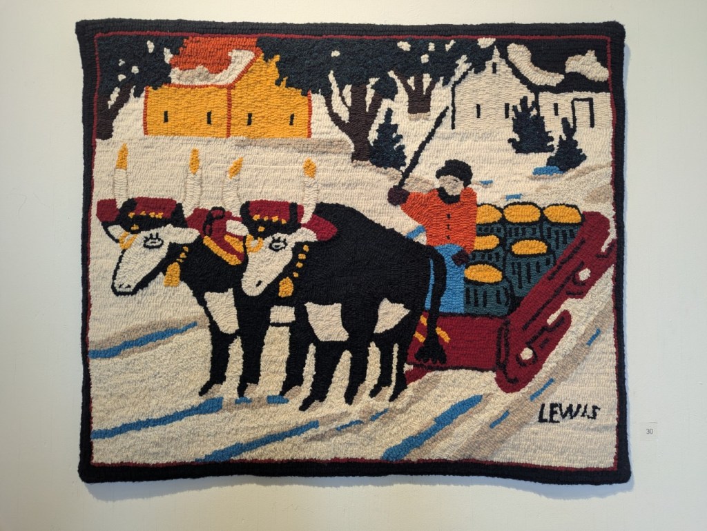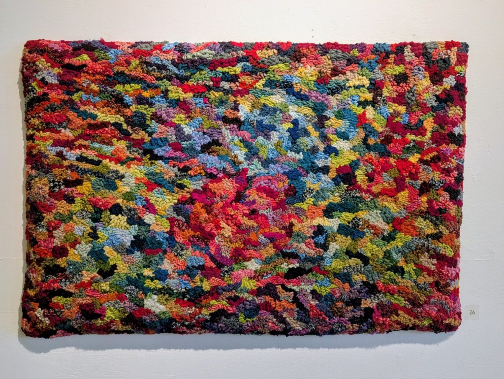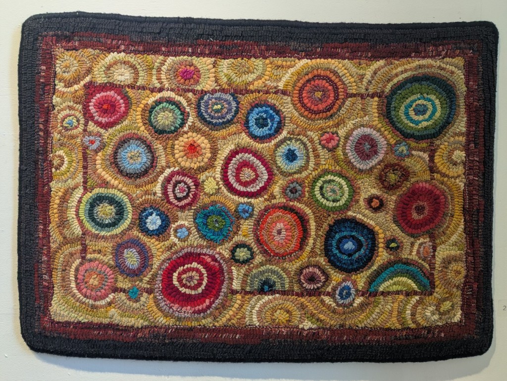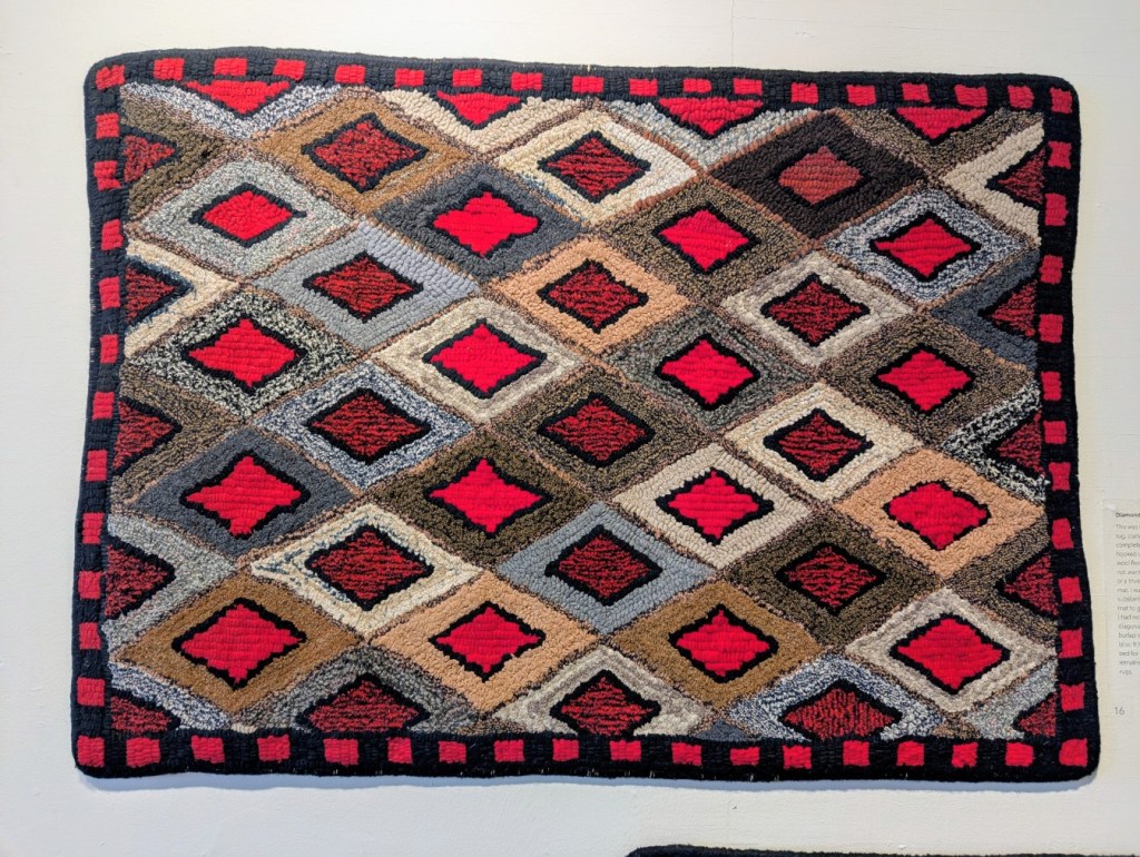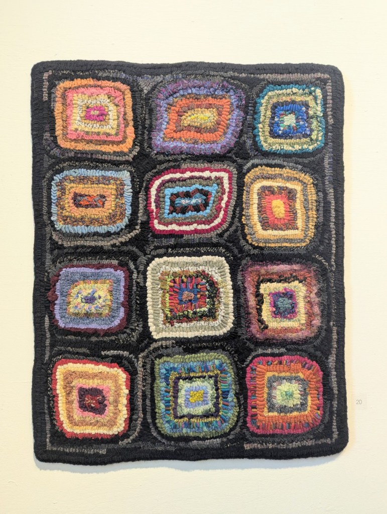 The Saint John Arts Center is the weekly meeting place of the Carnegie Rug Hookers group; a local organization of craftspeople focused primarily on Rug Hooking. Since I have started hooking myself, I am interested in meeting like-minded people. So, today Monica and I visited the Arts Center specifically so I could meet the people and see what they are creating. I was inspired and even picked up a couple of hooking tips during the visit. One of the group members, Tzigane Caddell, actually has an exhibit currently at the center. Wonderful to see that and get even more inspired. Here is some of her work.