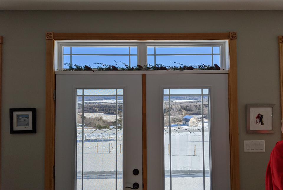 Life-long childhood friend, Cindy West of Cornhill NB, has a beautiful home overlooking the hills and dales with an uninterrupted view eastward toward Moncton. The glass in her house is expansive and the light is phenomenal. The double patio doors leading out to the deck are crowned with a split transom window where Cindy envisioned a splash of color to catch the eye.