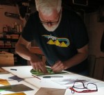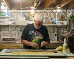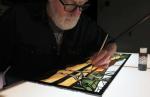 Cindy was willing to engage with me in the early decision-making phase. From concept to pattern creation, we communicated our ideas back and forth via email. With an onsite visit for pattern fitting, I was ready for the studio. Artistic intoxication is one way to describe the selecting of colors phase. So many options! The final pallet is green, gold, gray, red, brown, blue and white. I went entirely with oplalescent glass (as opposed to cathedrals) so the panels would show at night with the house lights on as well as in daylight. I also included some unique glass that changes color with light. All of it very impressionistic meant to represent trees, fields, bushes and even weathered boards on the bridge.
