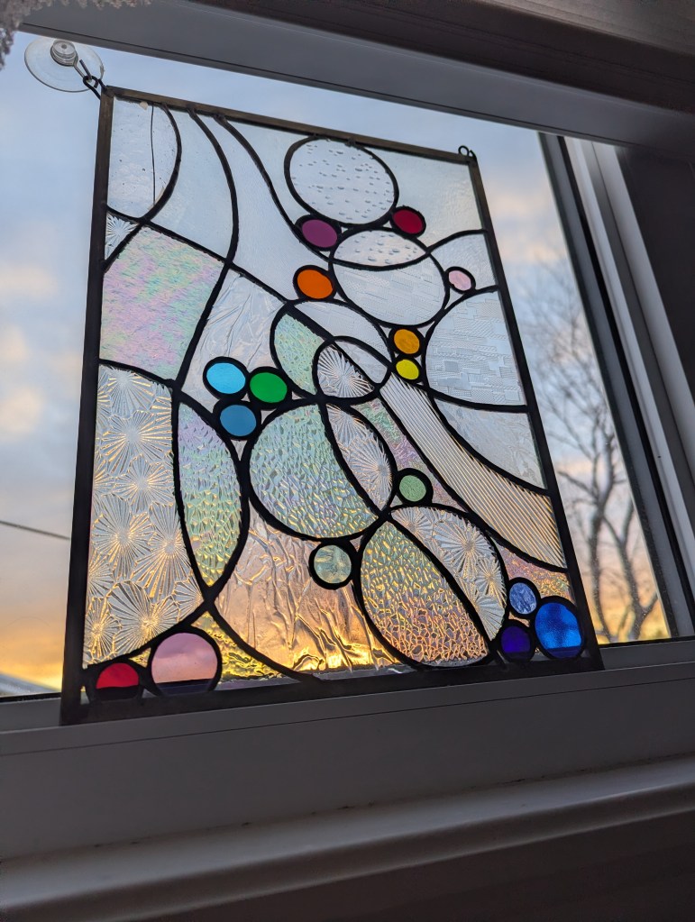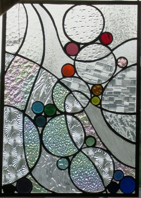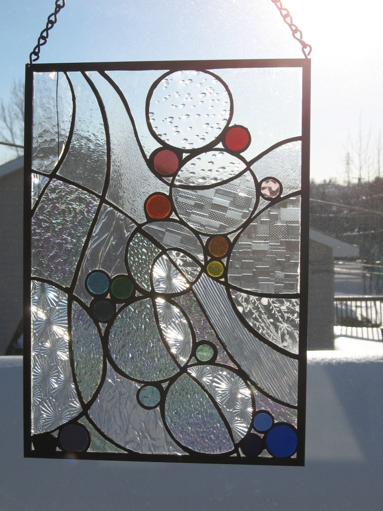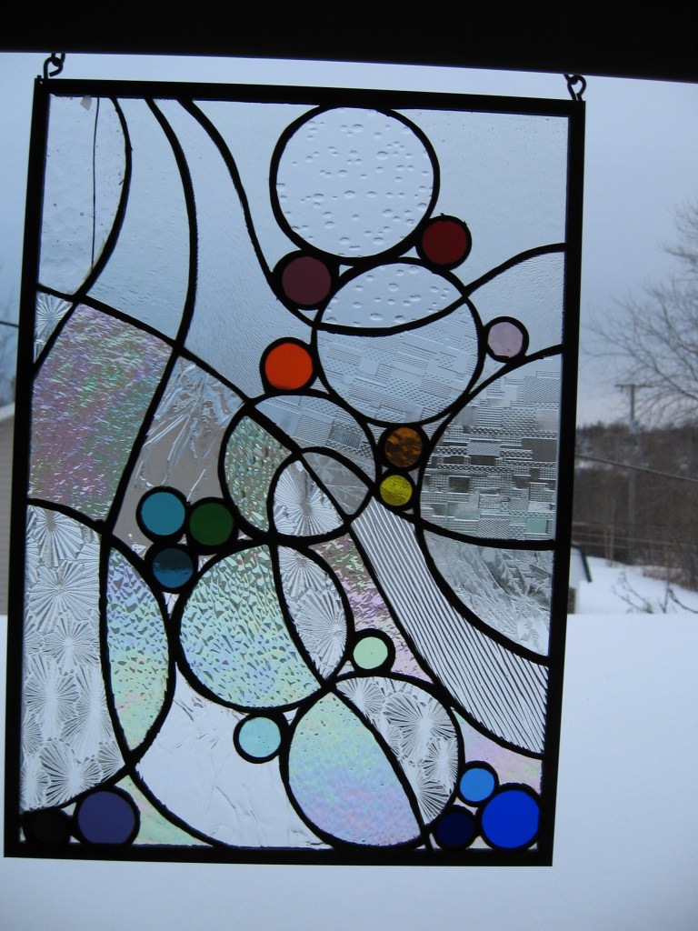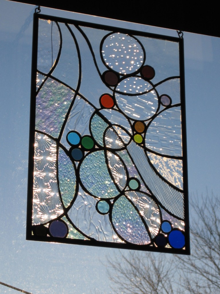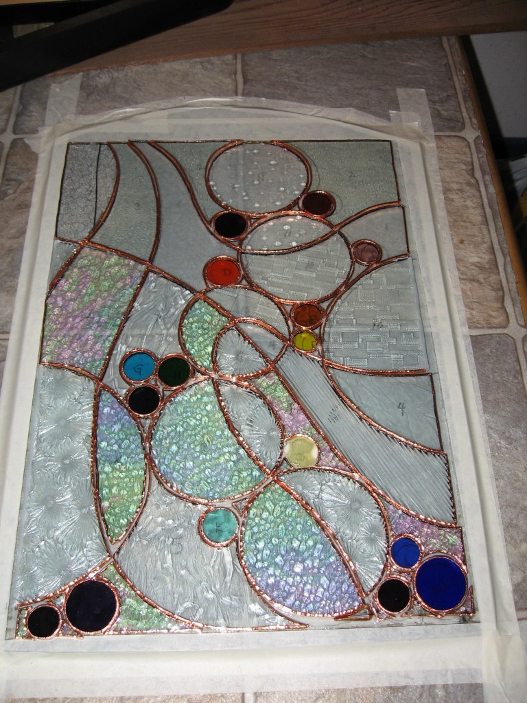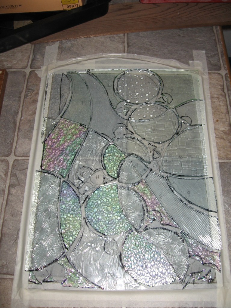 Originally the concept was for salmon eggs incubating in a stream, but then it evolved, as glass will do. I made this project when Brother in Law Ralph came to SJRH with heart trouble and Georgie Lee stayed with us for a few days. I drew this at the kitchen table talking with Mon and Georgie. Probably my first original design and I have wonderful memories of making it.