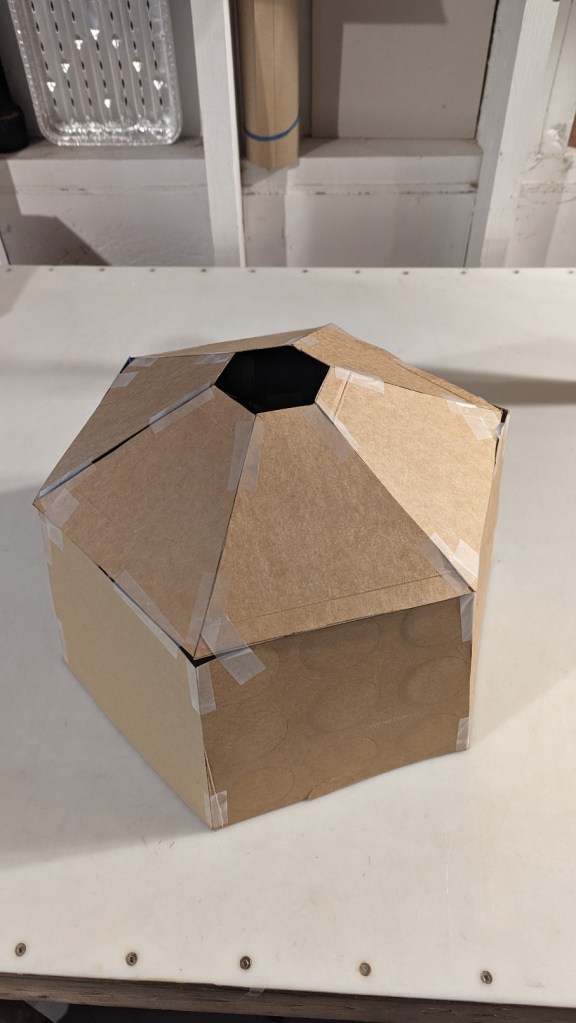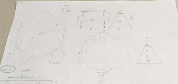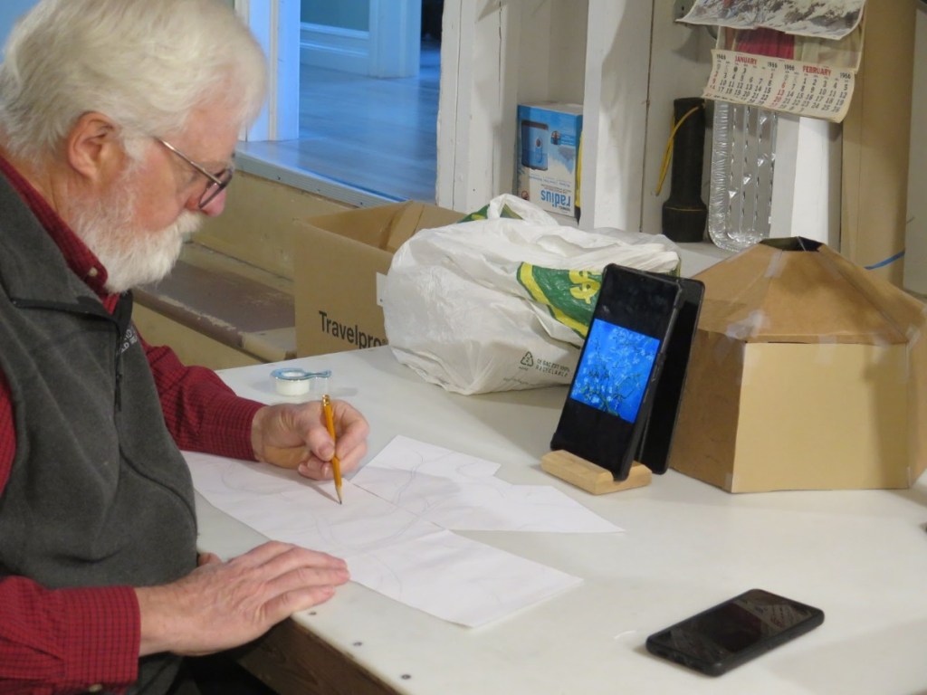 Monica envisioned a lamp to showcase the art. I was inspired. I had a 2-bulb base tucked away in my studio for such a need. It is 16″ up to the sockets with a hexagonal foot. That meant a 16″ wide hexagonal shade. For maximum show, I wanted the sides to be steep but not vertical with a shallow cap. I enjoyed the geometry in figuring out the dimensions. When developing the pattern, I tried to simplify Van Gogh’s original to make it more “glass friendly”. Nevertheless, the finished lamp still has 700 pieces of glass.