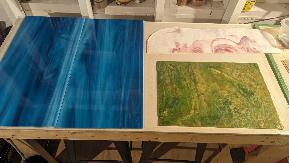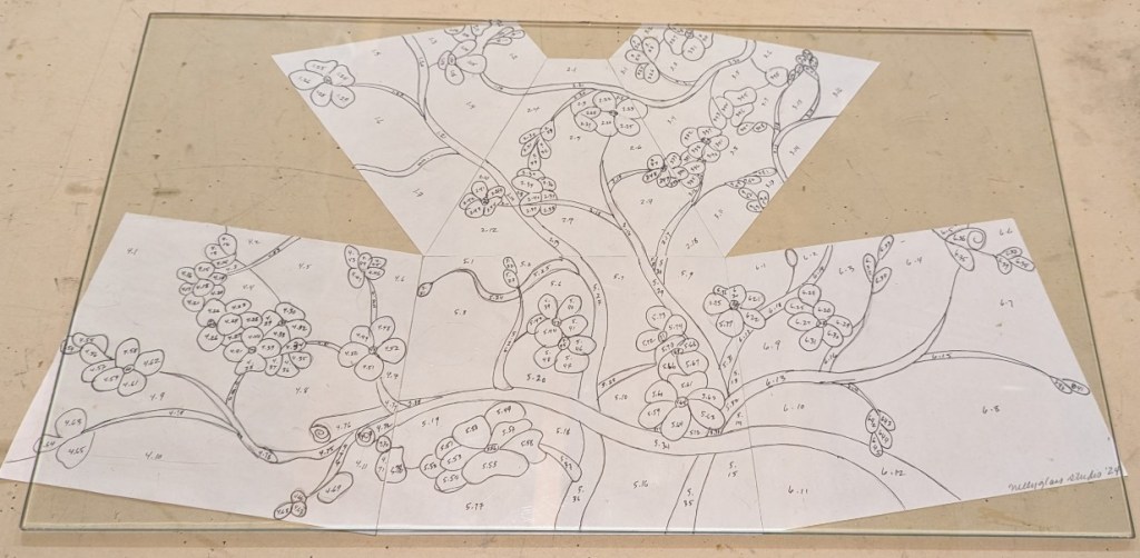 As I did not have the right glass in stock for the project, I ordered 4 square feet of Oceanside Aqua/Cyan wispy. The teals really come out under illumination. For the almond flowers, a tail end piece of Youghiogheny white/pink ring mottle and for the tree branches, Youghiogheny green/brown ring mottle.