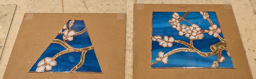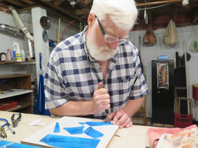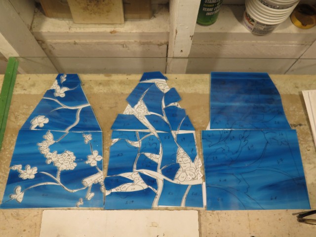 The cutting phase was relatively easy but the grinding phase was slow and tedious. Especially the blue glass. The shape of each flower petal had to be ground into the blue glass using 1/4″ bits. I went through three of those small bits and a couple of bigger ones by the time I was finished.