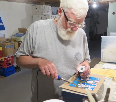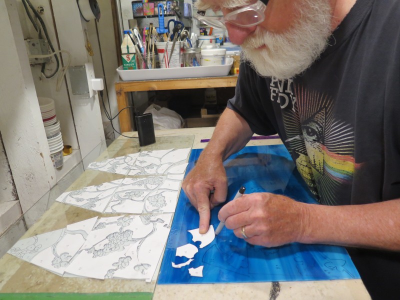 In total there are twelve panels (six pairs of top and bottom). The full pattern only covers half the lamp and is repeated on the backside. I constructed each pair from start to finish; cut, grind, foil and solder. Long days were spent in the studio… longer than I’m used to lately. Afraid I would run out of time, I only took one day off (Father’s Day). Through it all, Monica was my constant support both emotionally (with expressions of empathy and delight) and physically (with good nutrition and routine walking).
