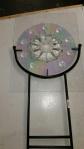 Back at the studio, the choice of which glass to use was difficult with so many options. For the 11″ round garden ornament, with Monica’s help I chose a clear candy dish with ornate green rim. I created a radial design setting the dish against an irridescent whispy green/pink glass embedded with 9 beveled jewels. Later I mused how it symbolized big brother Ralph and his nine siblings. I framed it with 1/4″ zinc came and mounted it in a garden frame. It should be strong enough to face the elements in a sheltered corner of the garden where the jewels will cast sun-drops throughout the garden.