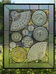 For the 18″x24″ window panel, I chose four colored plates all with a geometric design (pink, blue, yellow and green), three clear glass curtain florets, two clear glass fans and one clear plate. I played with several arrangements before settling on what I thought gave best color distribution across the panel. The 2″ border is made from irridescent clear hammered glass with shots of pink, blue, yellow and green throughout.