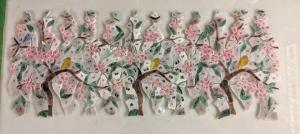 I studied how to make a 2-D paper pattern for a 3-D globe and then drew an animated apple tree with a little bird perched among the blossoms. It seemed appropriate as Kelsey’s grandparents were married in the spring-time in the Annapolis Valley of Nova Scotia – apple country!