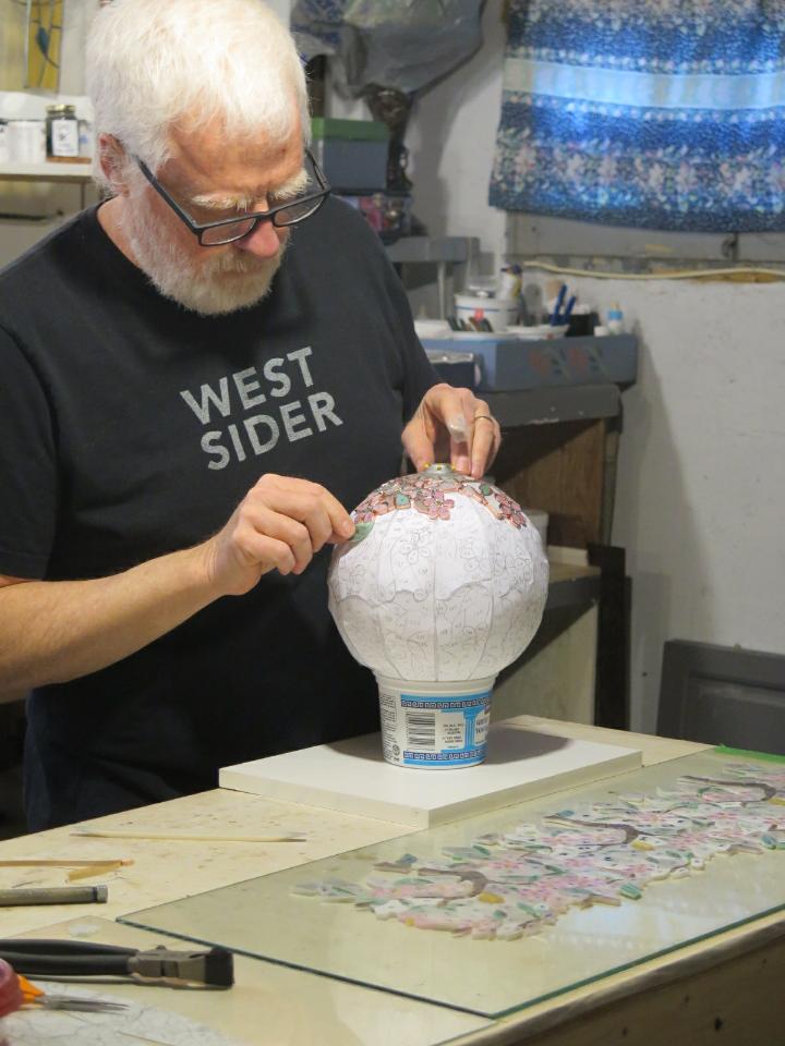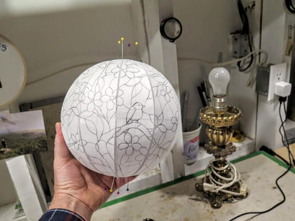 Inspired by some of the great lamps of Tiffany, I decided to attempt an 8″ sphere that sits on the base. Perhaps something with a spring-time theme.