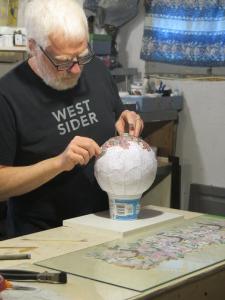 I had a wonderful time creating this lamp. It kept me busy and alert throughout the COVID isolation of winter ’21. The pattern is repeated three times around the globe, so keeping all those little pieces numbered and orderly was paramount. Diligence prevailed.
