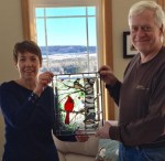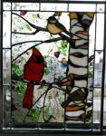 Monica and I delivered the finished panel to Cindy at her home and we’re very pleased that she loved it and looked forward to surprising her mom with this original piece of art from Nellyglass. She promised to send me a photo of her mother with her cardinal and chickadees.