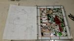 So the design concept was easy… a cardinal and chickadees in a birch tree. I perused the internet looking at images for inspiration and then drew my own pattern sizing it to 11″x14″ including a 1″ clear beveled glass border all around. Birch trees in particular are interesting for their varied bark so I incorporated some patches for different colors. I sat the cardinal on a branch at mid panel with one chickadee above and another below. Perhaps they are communicating with each other as birds do around the feeder.