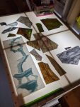 The artistic challenge was to create moss covered rocks. Working in the basement, using the flourescent light table is my only way to achieve line flow and symmetry. However, colors and intensity are distorted by artificial light. It’s not until I bring the finished piece upstairs to the windows that I get the true story. At first, I thought the baroque water glass was too stark (transparent) in comparrison to the other glass. But, as I studied it more, I noticed how the foliage outside my window shows through giving the impression of forest trees reflecting on the water. Then, as you move around the piece, shapes and shadows behind the glass change giving the illusion of moving water. Delightful!
