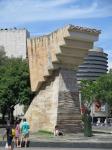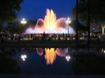 Later in the evening, we strolled from our apartment 1 km to the Placa Españya at the foot of Mont Juic to see the Magic Fountain show. This is the site of the 1929 International Exibition and is totally mind blowing. Getting there, we walked past a modern sculpture by Joan Miró (we saw his work in Chicago), past the Moorish influenced Torres Arena (built as a bull fighting ring but now a shopping mall), past the ornate central fountain (influenced by Gaudi), through the massive twin Venetian towers, along a corridor of vertical fountain jets toward the Palau Nacional (now a museum) with it’s breathtaking cascading fountain. At the foot of the stairs to the Palau, the Magic Fountain show started precisely at 9:30 to the delight of the huge crowd gathered there, young and old, happily milling and dancing in the mist from the water jets timed to music. It was just like watching fireworks… that oooh and awww sense you get when mesmerized by moving color against a night sky. It was truly spectacular and we are so lucky to catch it as it only runs periodically through the the summer.