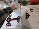 Next, to choose the colors. There are so many options that there were several “right” choices. After alot of humming and hawing, I settled on a dusty rose cross with a burgundy circle around the center and a burgundy border around the outside- both colors of glass cut from the same type of wavy cathedral. For the background, I chose an iridescent rough rolled glass that will show the colors at night when the lights in the room are on. The outer border would be the same irridescent glass.