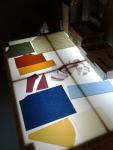 Each panel is 6″ square and the total finished piece is about 35″ long. I chose a variety of textured cathedral glass in colors across the full light spectrum.