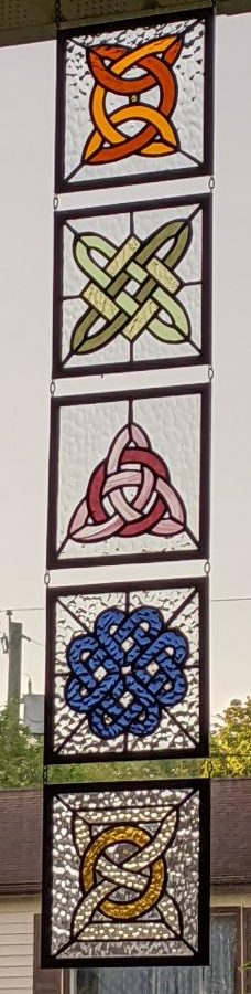 Originally designed as a horizontal transom, I adapted it as a window hanging with five separate panels linked together and suspended vertically.