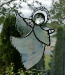 Monica loves angels and Christmas is coming so I decided to make some. I found a design online that I liked. A trip to Downey Stained Glass for glass, jewels and halos and I was ready.