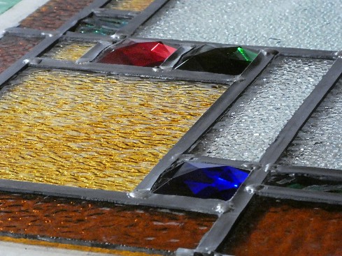 I enjoyed the quiet studio time while leading. It was good exercise moving around the table continuously bending and stretching. For vertical strength, I added lengths of copper restrip (flat ribbon) on either side of the two central cames. The biggest technical challenge was squeezing those extra thick jewels into the came channels. By the time I finished leading the first panel, I realized I had miscalculated the amount of lead came required for the entire project. That meant another urgent call to Kim. She saved me again (for the umpteenth time). Thank you, Kim, for your excellent service.