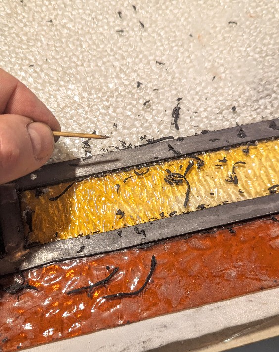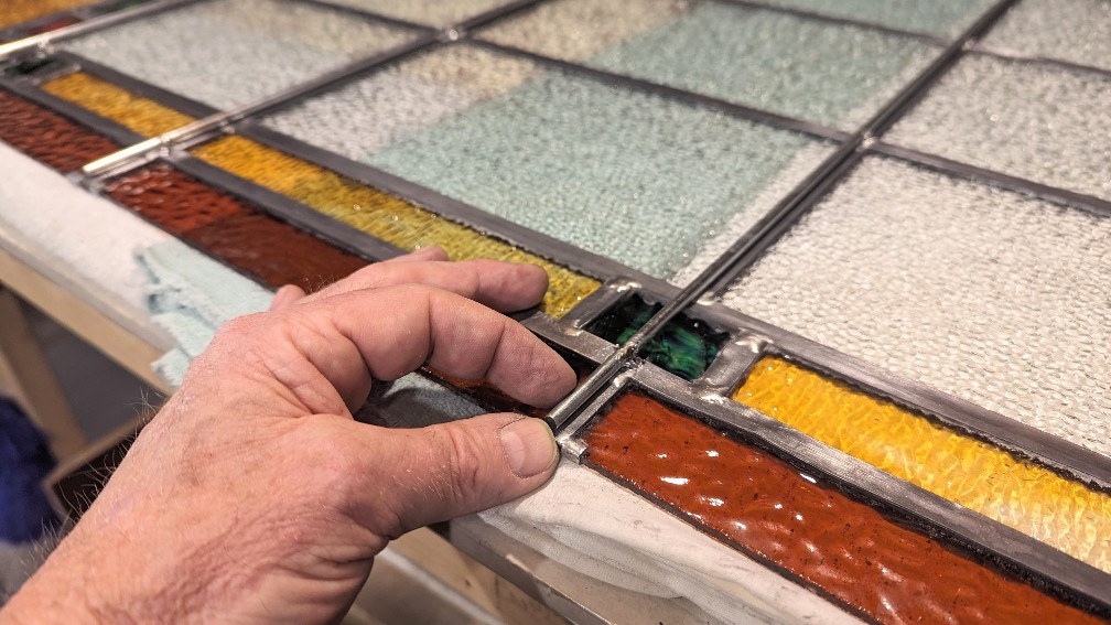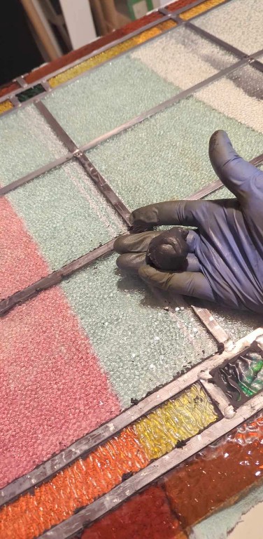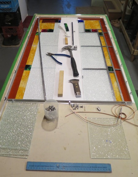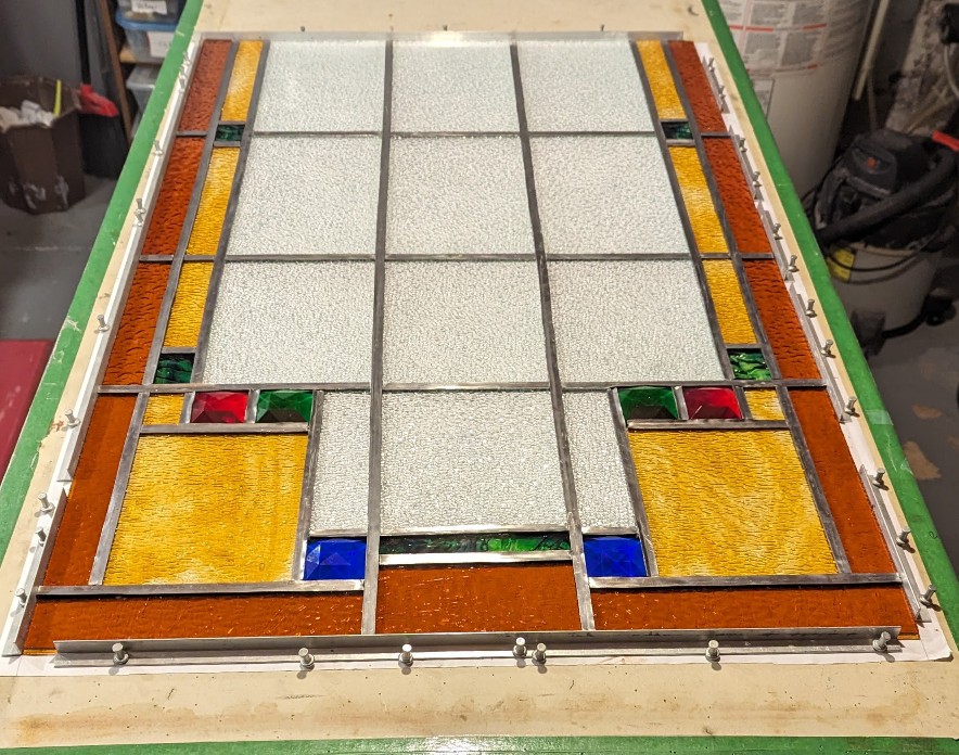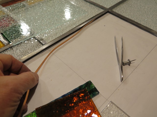 After the putty had cured for a couple of days, I picked the putty off all the edges on both sides and gave the glass and cames a final burnishing with whiting. At this point I also soldered zinc plated steel rods across the back for horizontal strength.