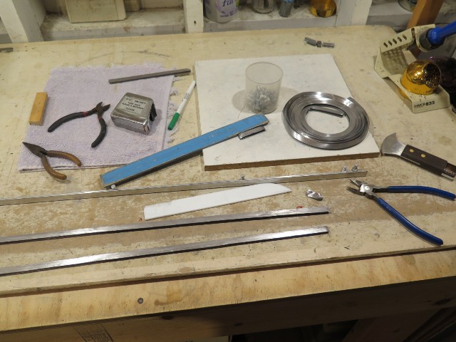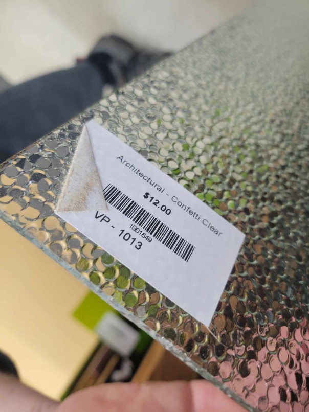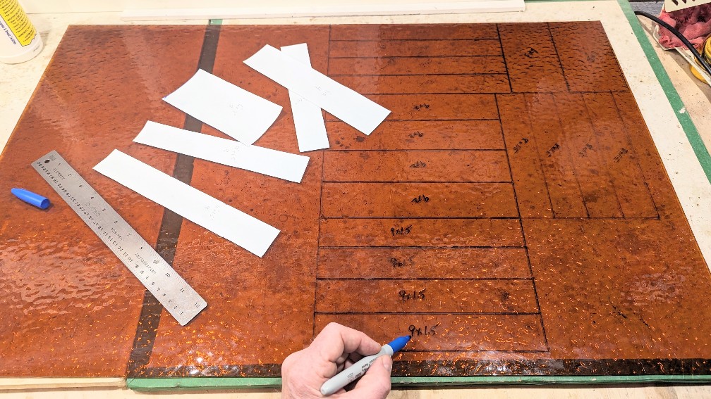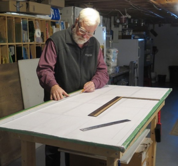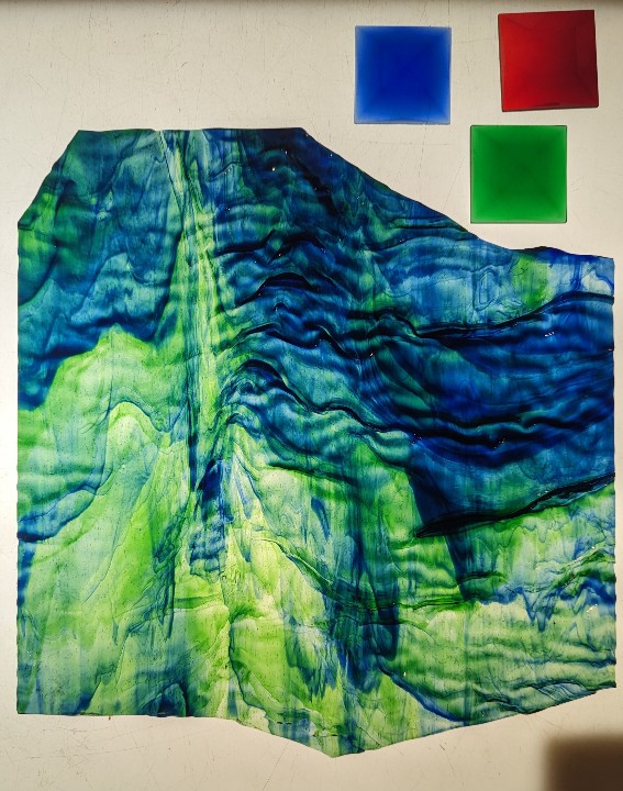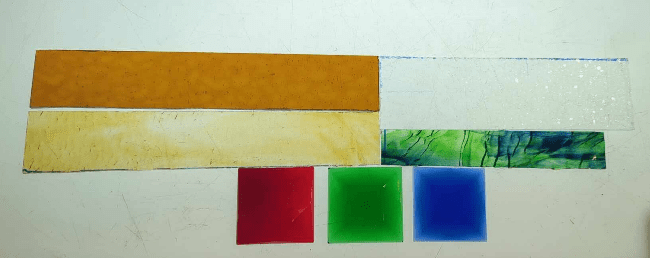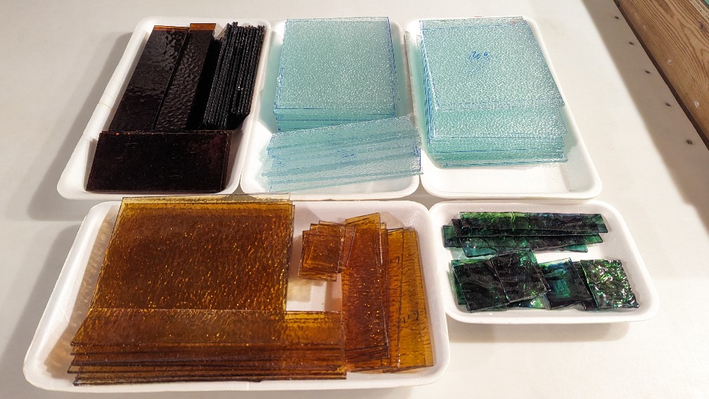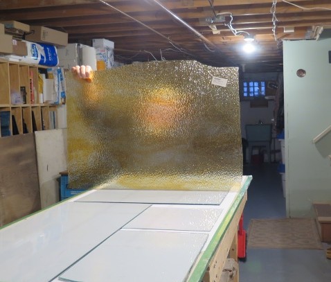 I gathered all the required supplies before the end of the year so I’d be ready for a quick startup in January. The glass was found in Saint John at the studio of Kim Killam. Large (2’x2′) sheets of yellow and orange and three large sheets of clear textured at a good price. (Thank you Kim). The blue/green ripple glass was from my own inventory. The jewels were sourced online in both Canada and the U.S. The finished surface area would be 20 sq. ft.