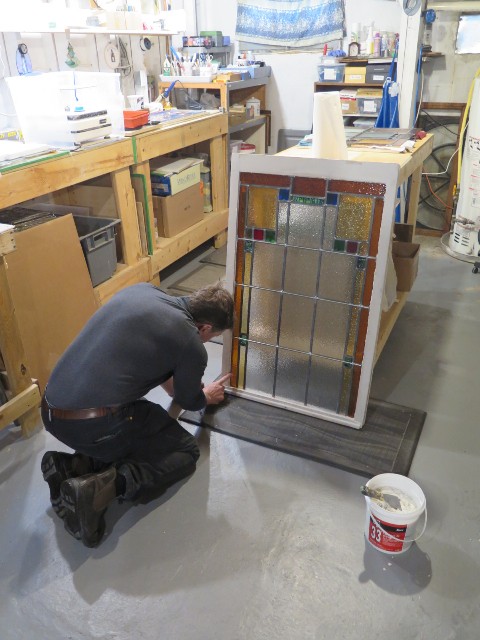Carrie’s carpenter was on hand in my studio to ensure a proper fit and to pin the glass with metal clips. Fortunately, there were no issues. With the glass secured in place, the carpenter took the sashes back to his shop for final preparations before installation (oiling the wood, sealing with putty and priming/painting). Then I would wait for a photo of the windows in situ.