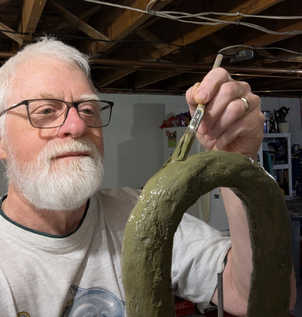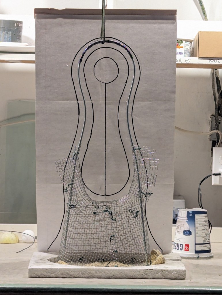Building the support form was an exercise in bending steel rods and shaping hardware cloth (wire mesh). I love rainy days in the studio when there’s no call to be outside. Here are some construction pics.