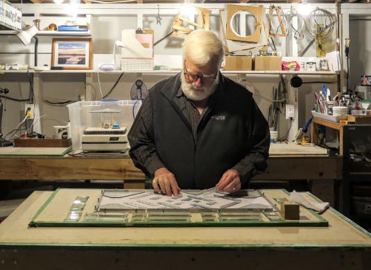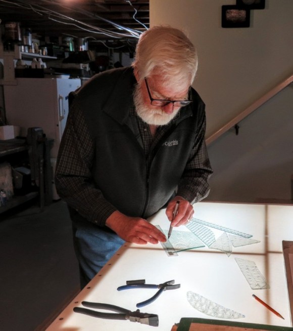 Sized at 12″ x 26″, there are 54 pieces in the pattern and 30 of them are beveled. The chosen kitchen window in Darlene’s house has a south-western exposure so all those bevels suggest a brilliant show when the sun is shining.