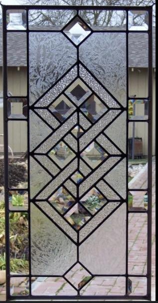 Before I had retired my business in ’23, Sister-in-Law, Darlene Gallant Taylor, put in a request for a kitchen window panel. When I met with Darlene early in ’24 to discuss potential designs, she already had one in mind that she found online; an all clear design with three interconnected diamonds down the center. Darlene mused how it reminded her of her three children; Nicholas, Haley and Whitney; all adults now with children of their own.