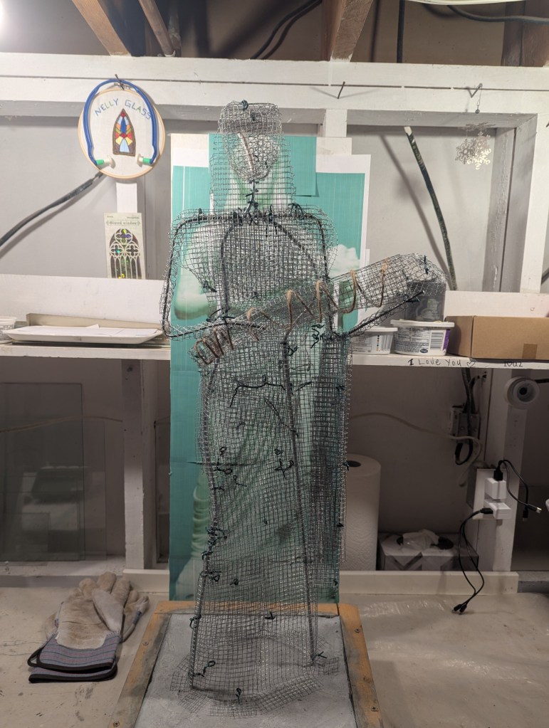 I wanted to have Demeter’s name on the base of the statue. To achieve this, I made homemade modelling clay letters out of corn starch and baking powder. Then I glued them onto the inside of the base form in reverse so the name reads correctly when the forms are removed. The internal wire framework was cemented into the base and then the wire mesh was added to form the body.