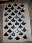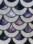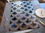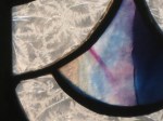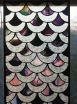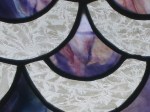One of my earliest panels and a good project for practice in cutting circles. I also learned from this project that it would be better to have the table lit from below or to use a light box so one can see the colors while assembling the piece. The way I did it on a dark table meant that I didn’t get the best sinuous flow of the veins of color in the glass. However, when unlit (which is how I saw it during the build), it looked like the hand of God reaching out from behind a waterfall!!!
