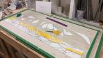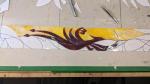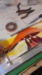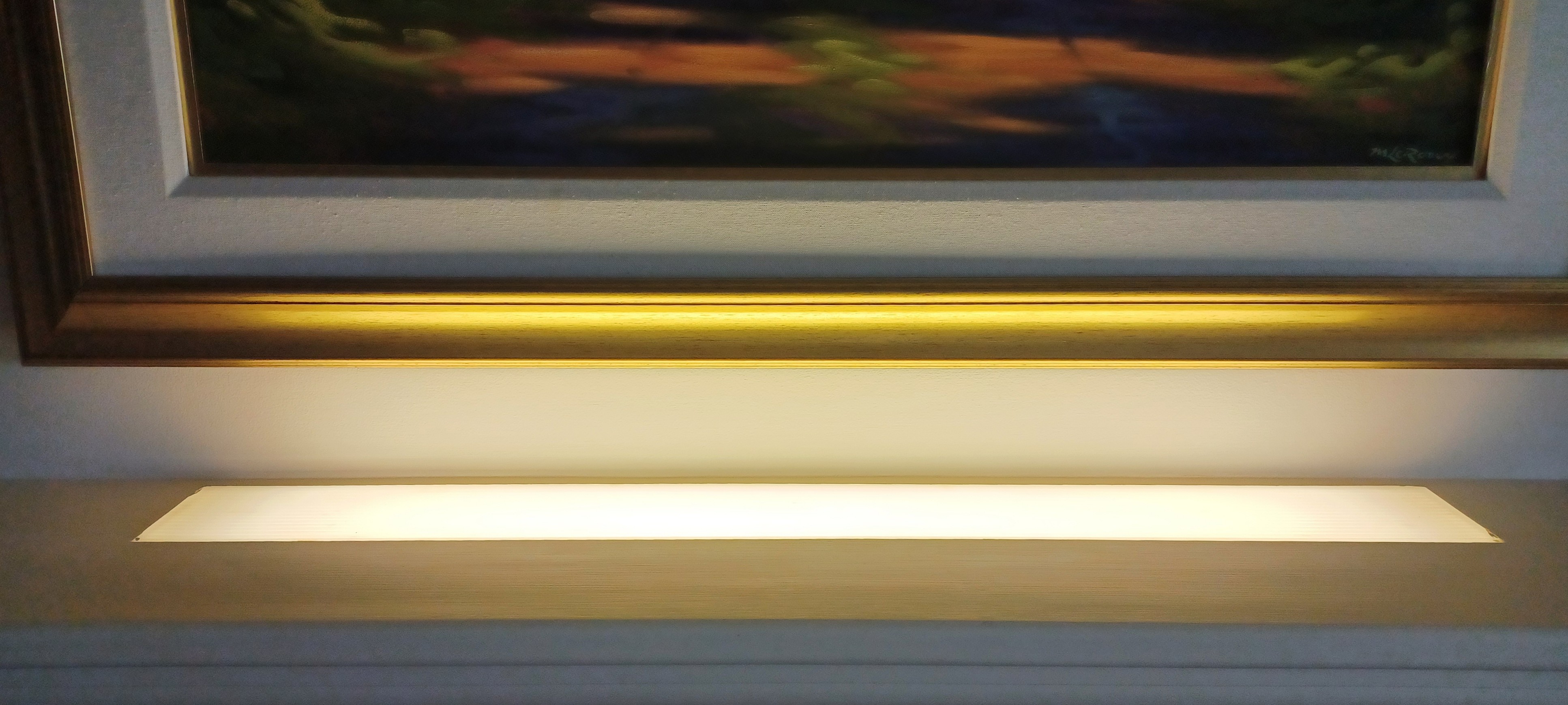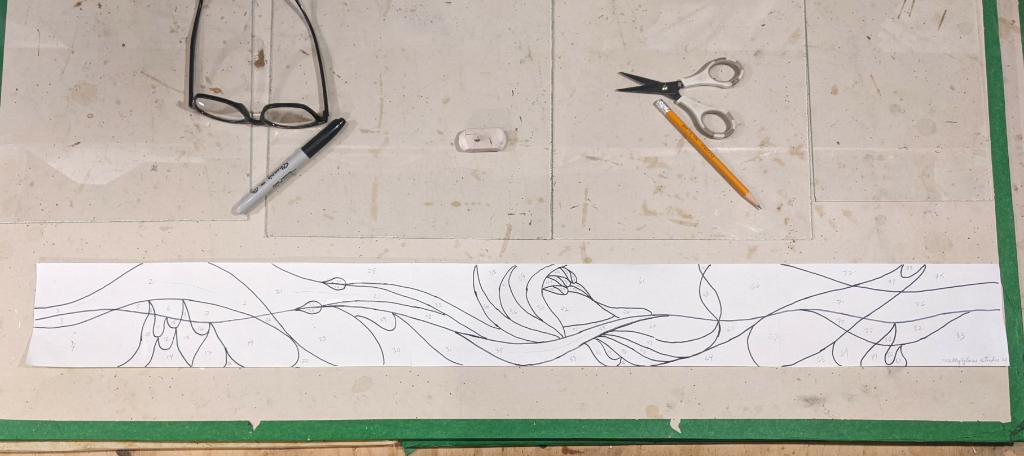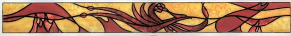 I have a long-standing fascination with the mythological phoenix and have long-wanted to make one in stained glass. I was just waiting for the motivation when friend and former colleague from NBCC, Jenny Forestell, contacted me. In her house, there is a fireplace with a very unique mantel. It has a built-in florescent light with a plain glass cover, 93cm x 10cm.