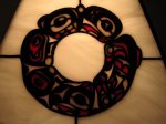 I’m building a Haida Night Light. It has 4 panels, each one 8.5″ at the base and 2.5″ at the top, so quite small. Each panel has a Haida design in the center; the Sun, the Moon and two panels with the same design: a circle of Totems containing a Salmon, a Bear and an Eagle. There are many many small pieces of glass in this lamp.