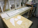 With materials purchased, it was back to the studio for me to create the paper pattern and frame up the lay out on the workbench (3 hrs). At 5 ft in length, this is the longest piece I have tackled to date and I had to extend my work surface over two benches.