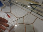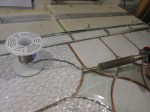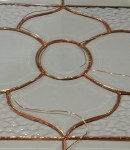 The first pieces foiled were the 28 perimeter bevels to see if they might expand the length of the panel slightly once all were foiled and laying end to end. Result, yes the panel did expand slightly and I expanded it even further (3/8″) to allow for five runs of 20 gauge copper wire down through the panel in five locations. This will add strength to the piece, won’t thicken the solder lines too much and will make hangers at the top- bonus! Total time foiling and wire incorporation, 10 hrs over three shifts.