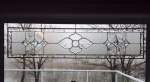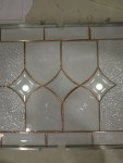Charlotte chose a large central bevel cluster and designed a trio of diamond bevels on either side all surrounded by clear textures (hammered and baroque). Surrounding all that would be 1.5″x5″ bevels. The five distinct kinds of glass in this piece (two clear textures and three different bevels) and the way they are combined create an elegant tension. The eye is carried across the piece by the hammered glass pausing momentarily to follow the lines in the baroque glass. The bevels around and throughout the panel give it form and structure. Simple and timeless.
