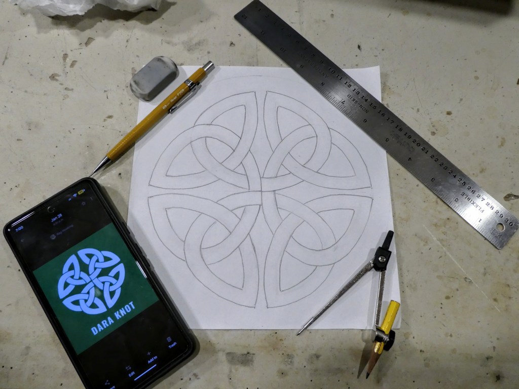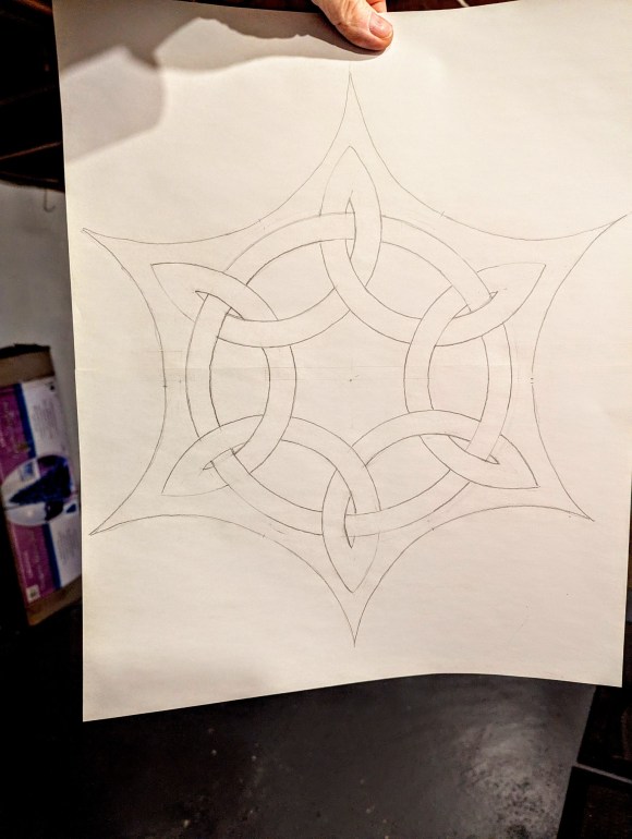 A series of Celtic knots, each one with a different symbolic meaning. From left to right, top to bottom: Dara, Trinity, Shield, Sailor, Solomon and Triskele. I found images online and drew my own patterns on paper sized to 8.5″ each. I love doing pattern work especially if there’s geometry involved.