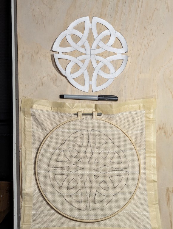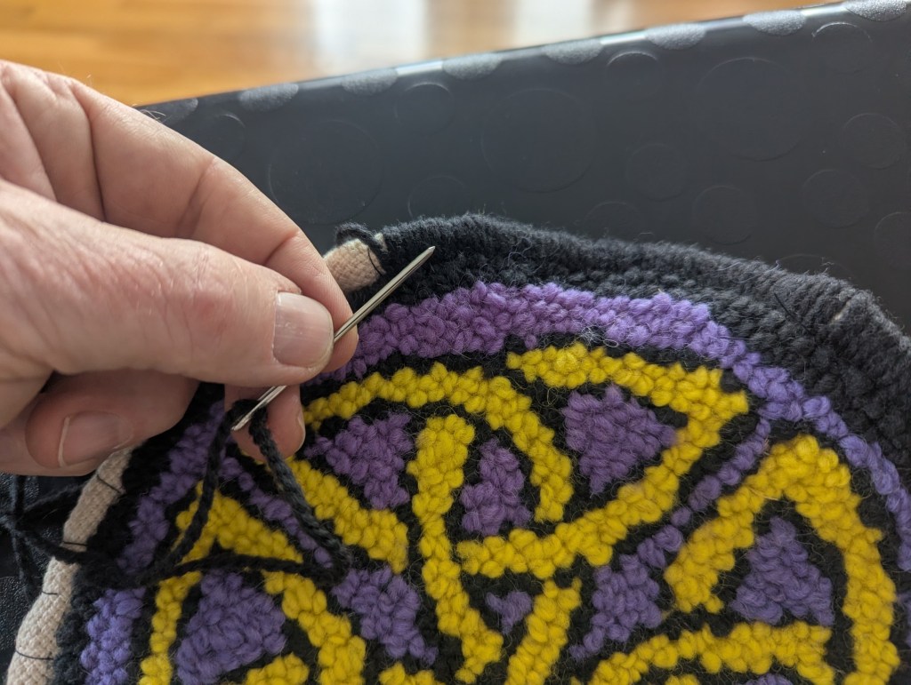 Once the six knots were finished it was on to make a design for the center. I decided on a six-pointed star with a ring through the loops. Because this center piece is larger than my 9″ frame, it required moving the cloth several times to hook the entire surface.
