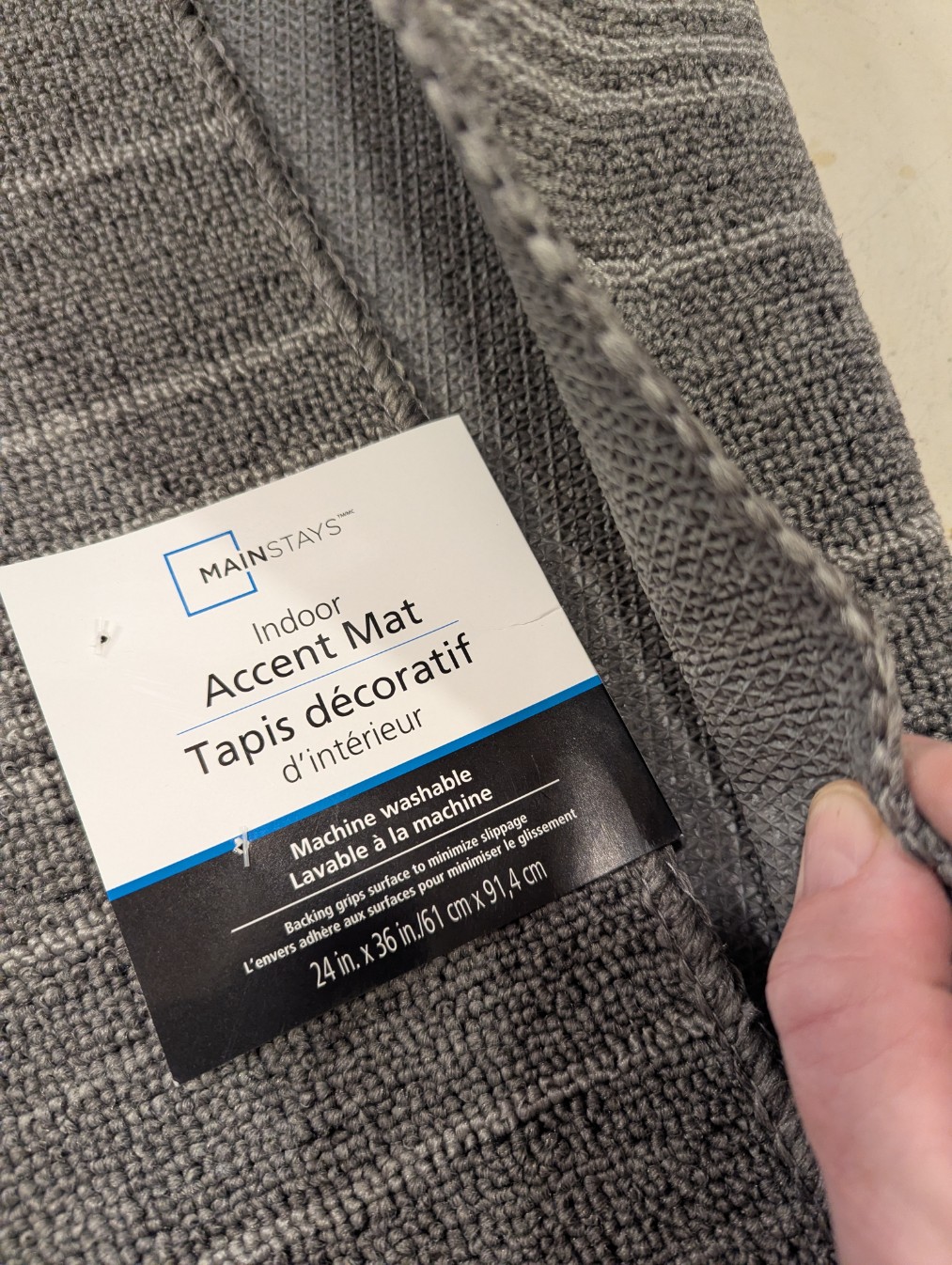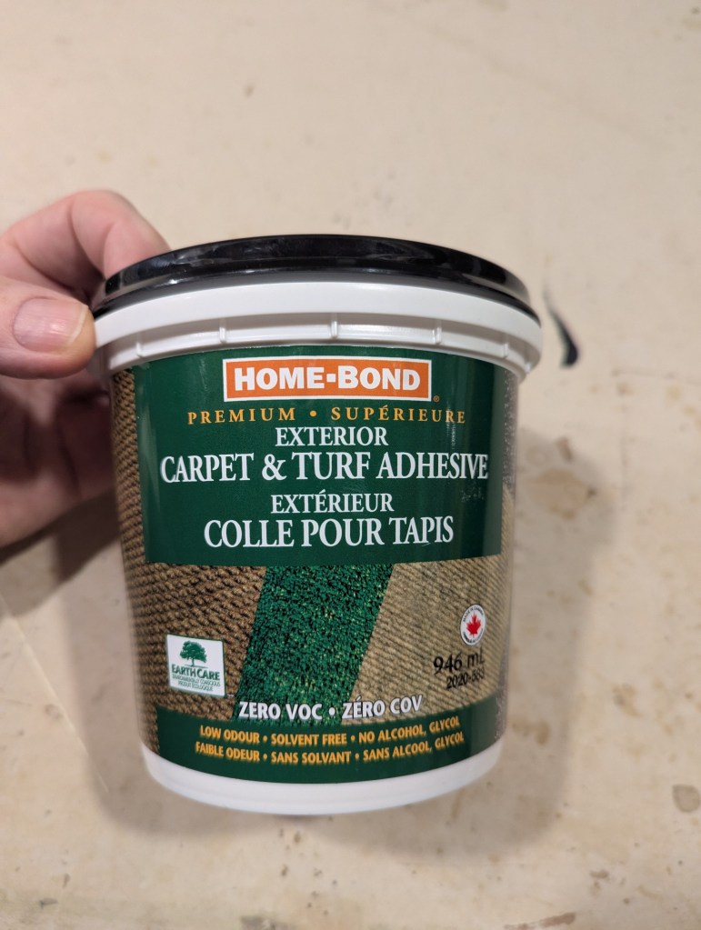 Since it was not originally designed as a one-piece rug, the next step was figuring out assembly of the seven pieces. For underlay, I bought a cheap anti slip mat from Walmart and trimmed it to the shape of the circles. Then I glued all pieces together with latex adhesive (Home Hardware).