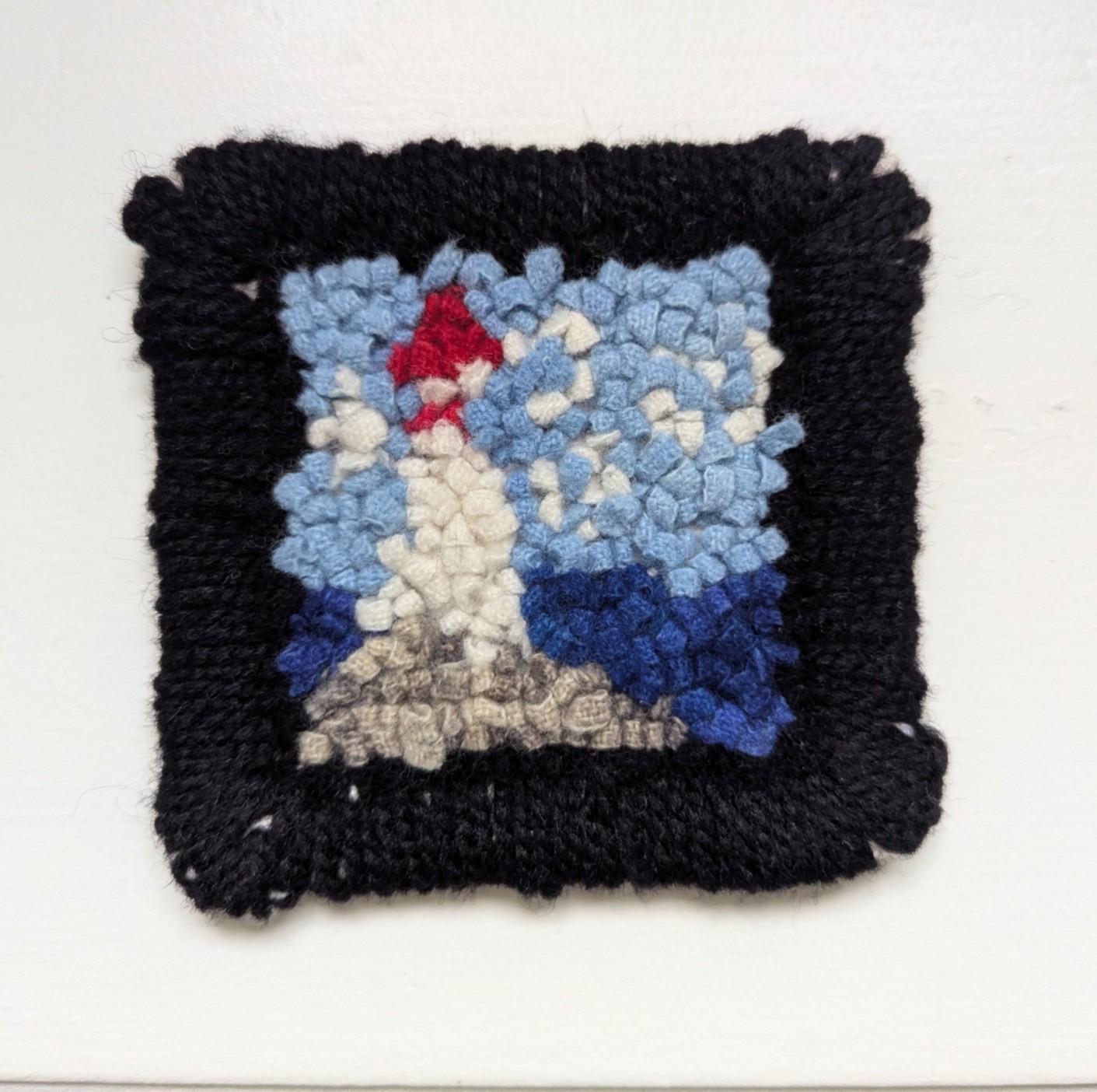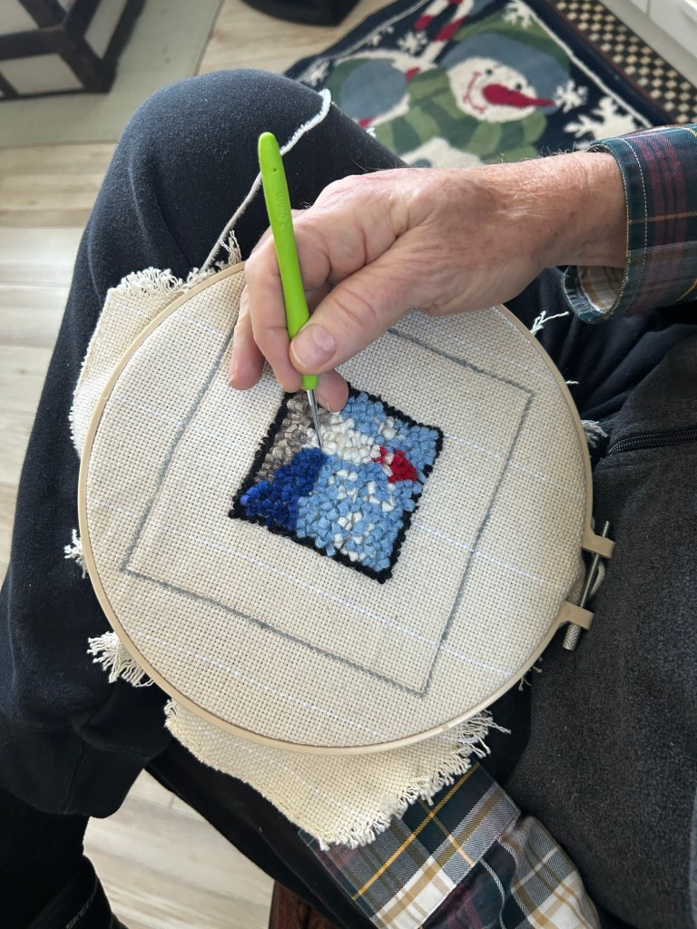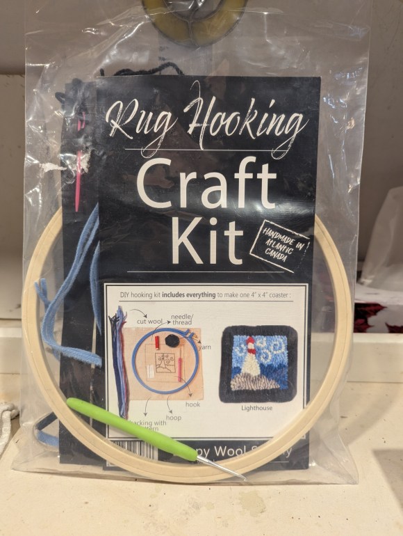 Monica has given me hope. For Christmas ’25, she gave me a beginner’s rug hooking kit with everything included to make a 4″ coaster … a cute little lighthouse on the rocks.