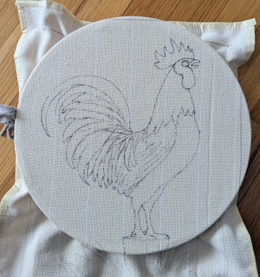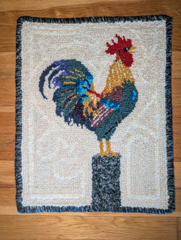 I admit it was more difficult than I expected. I struggled to define the feathers so they wouldn’t look like a big blob of wool. I also struggled with what to do for the background, flip-flopping between a pastoral scene or something abstract. In the end, it became off-white scroll lines around the rooster against a darker off-white background. The contrast is barely noticeable and only in some lights. Sort of like a secret embellishment.