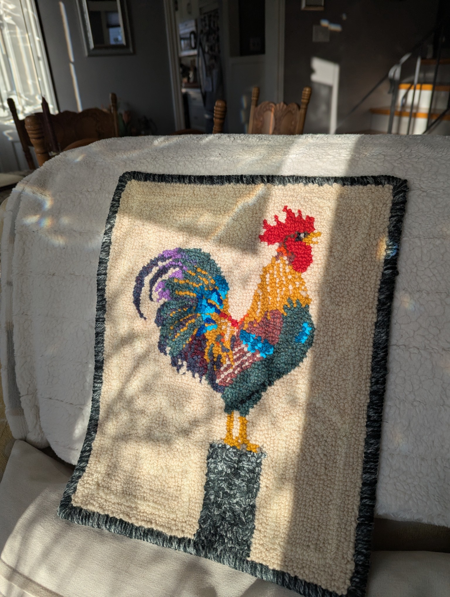 I admit it was more difficult than I expected. I struggled to define the feathers so they wouldn’t look like a big blob of wool. I also struggled with what to do for the background, flip-flopping between a pastoral scene or something abstract. It became neither. Instead, I designed scroll lines around the rooster in off white against a darker off-white background. The contrast is barely noticeable and only in some lights… like a secret embellishment!