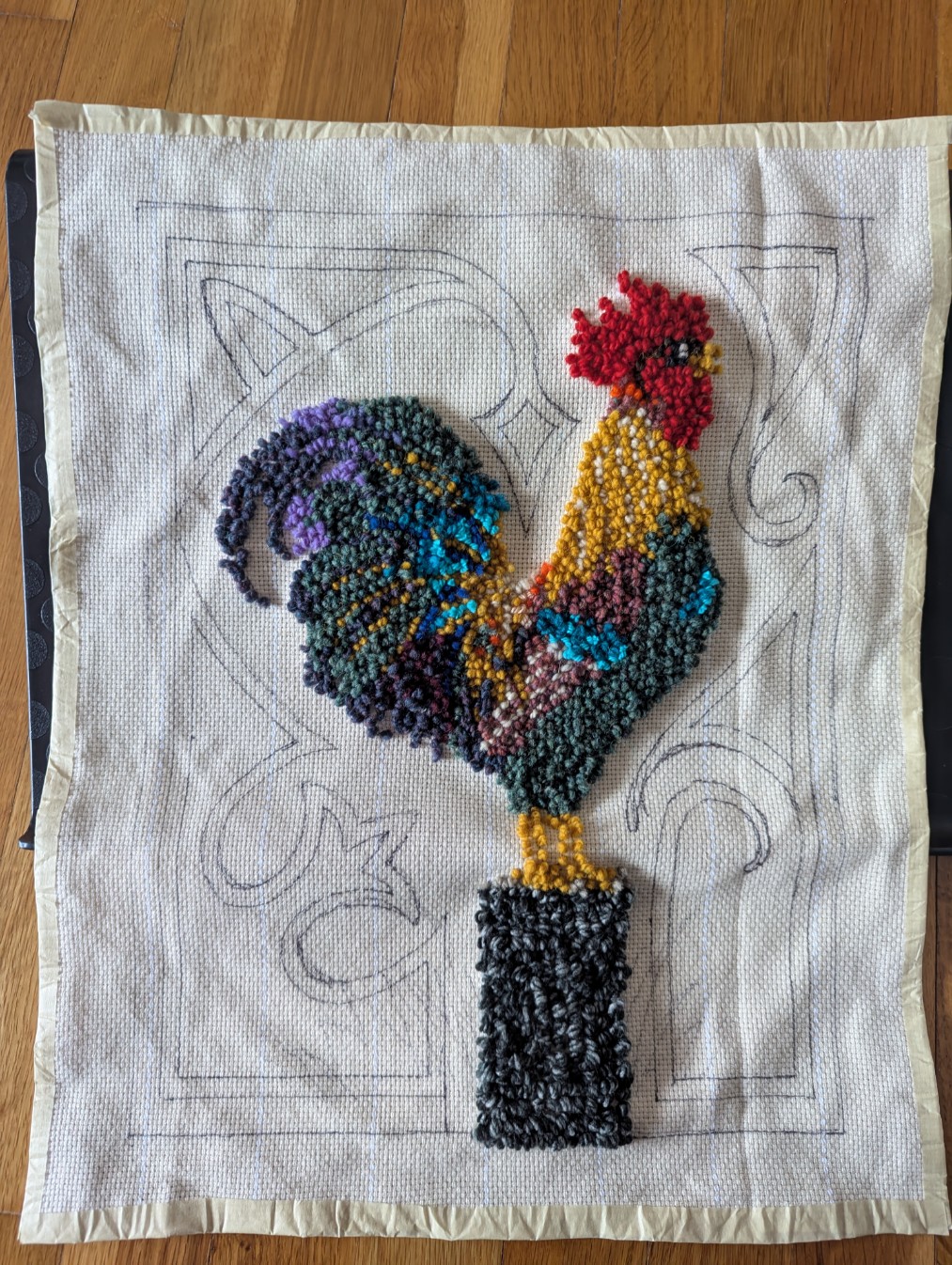 Instead, I designed scroll lines around the rooster in off white against a darker off-white background. The contrast is barely noticeable and only in some lights… like a secret embellishment!