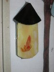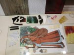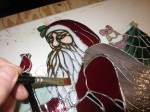 Got Santa’s toy bag contents plus the cardinal and lantern cut and ground to fit on Sunday (Nov 8). What a pleasure to cut and grind glass again…I love it! The white trim on Santa’s coat was especially tricky and I broke a couple of attempts. Perseverance did win out in the end. Cutting and grinding continued through the week until Wednesday, Remembrance Day. (I took time to pause and remember for awhile, especially my Grandfather Keith from WWI- he was 23 in 1913).