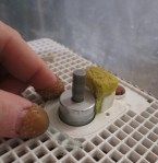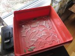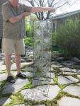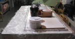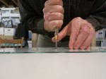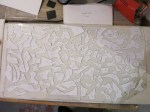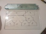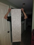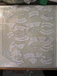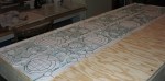 Broke out the background pieces the last weekend of March Break (March 8-9, 2014). With the “break” over, it was time to grind glass. Went to Kent’s and bought a sheet of 0.5″ sheet rock for framing the panel on – cut to 52″ long so it would overhang the table top. This is what I will fasten the frame jig to later on. Monica helped me slide the pattern and pieces onto it the sheet rock. Helping hands are appreciated.
