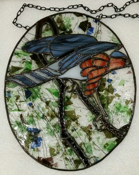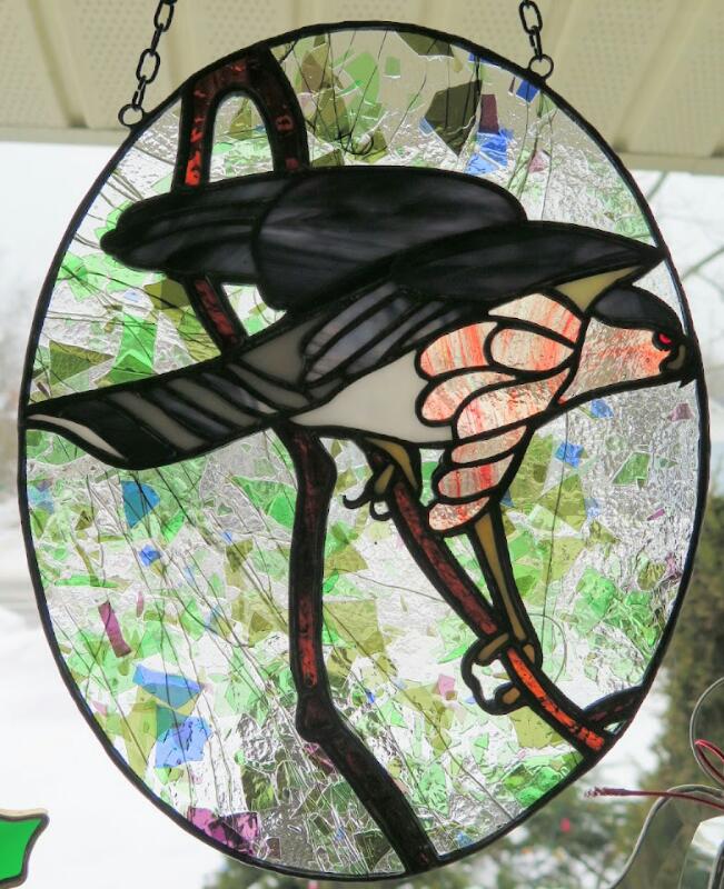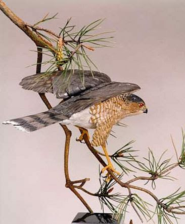 The Nelson’s gave me lots of time (6 weeks…and I took it all right to the week before Chrismas). Nevertheless, I started early looking around the Internet for inspiration. Of all the resident woodland hawks here in eastern Canada, the Sharp-shinned Hawk is one of the prettiest with its red eyes and orange and white striped breast feathers. Not much bigger than a pigeon, they are fast and deadly as they flit among the trees hunting for prey throughout our forests. I found several nice images of this beautiful little raptor until I finally settled on a photo of a sculpture by Patrick R. Godin of Ontario done in 1997. The artist sculpted an adult (both sexes look the same) with its wings up for balance as it alights on a white pine branch. It nicely shows off the striped breast feathers. I decided to use this pose but substituted the pine needles for a background of Urobos fracture glass that looks like foliage in the distance.