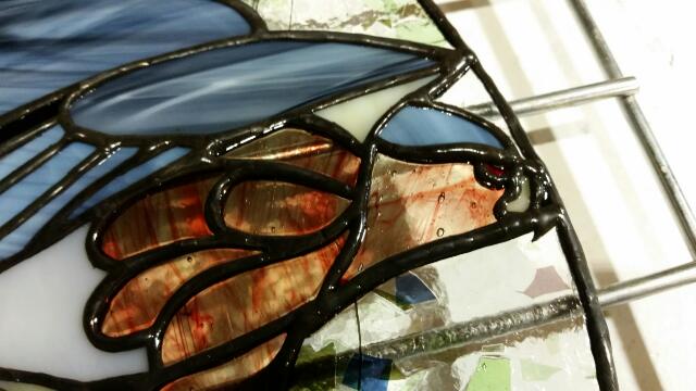 The first 6 hours in the studio saw the bird and background cut and ground to fit. Another 3 hours finished the rest of the panel. Foiling was a happy 4 hours on a sunny Thursday afternoon. (17 hrs to date). I especially liked adding the beak and talons of the bird. To achieve that, I cut out foil overlays to stick on the glass.