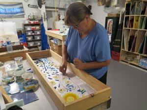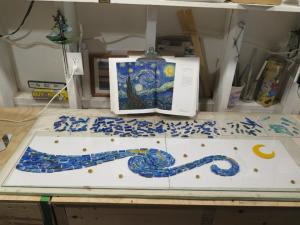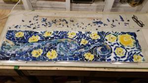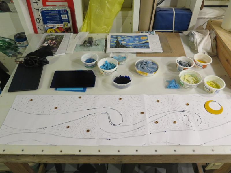 Next I browsed my scrap-glass inventory for suitable colors…mostly blues and yellows with shades of white, grey, orange, and green. In keeping with Van Gogh’s style of linear brush strokes, I cut the glass into many small bits… some less that 1/4 inch long. We would build the scene with these little strokes of color… like he did.